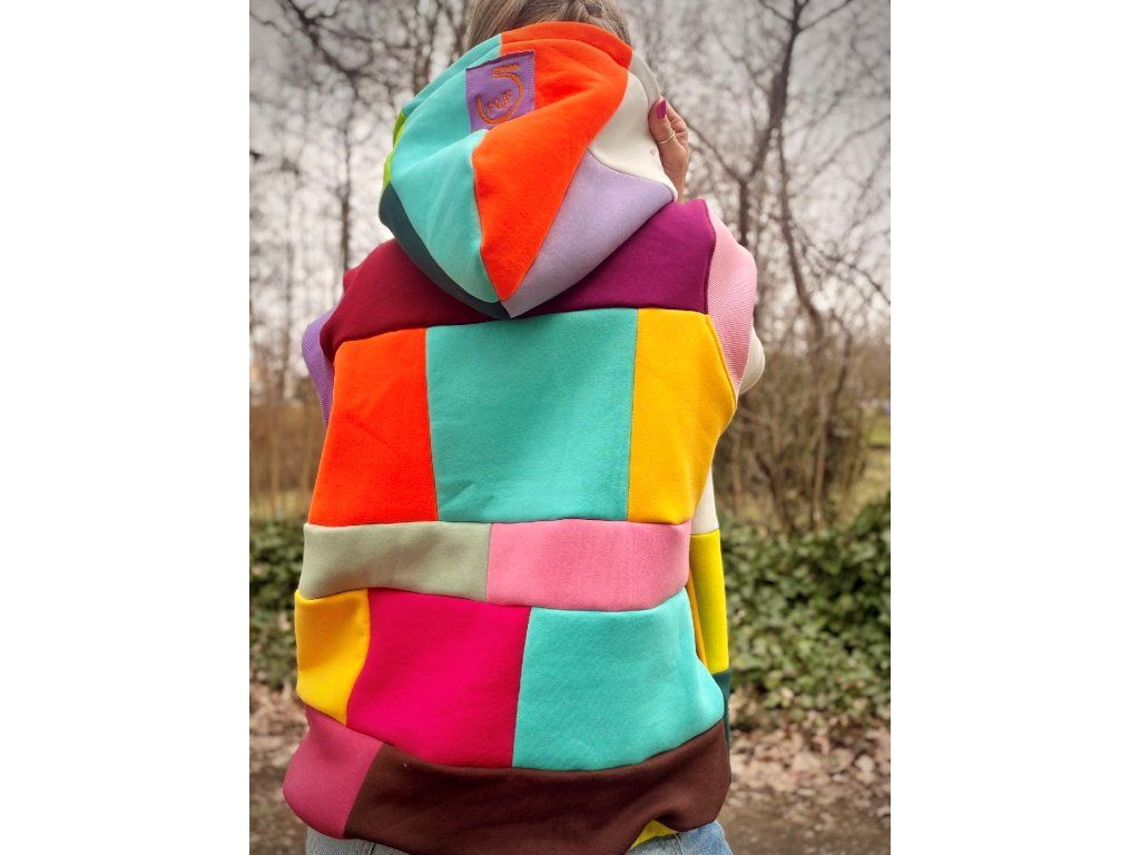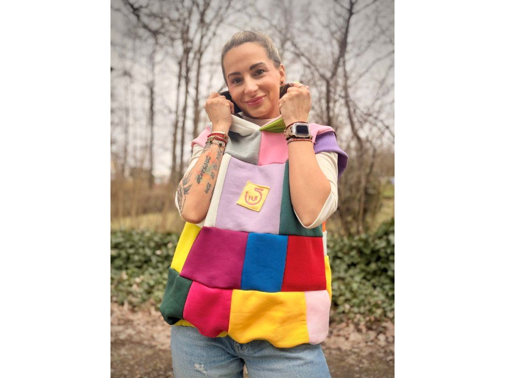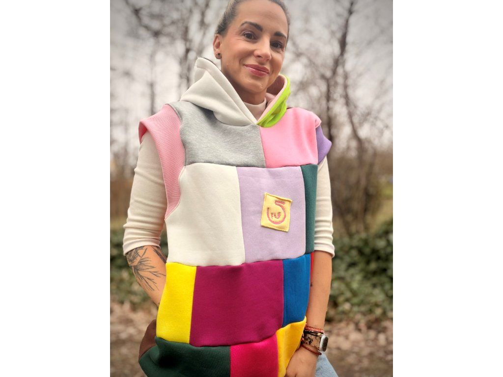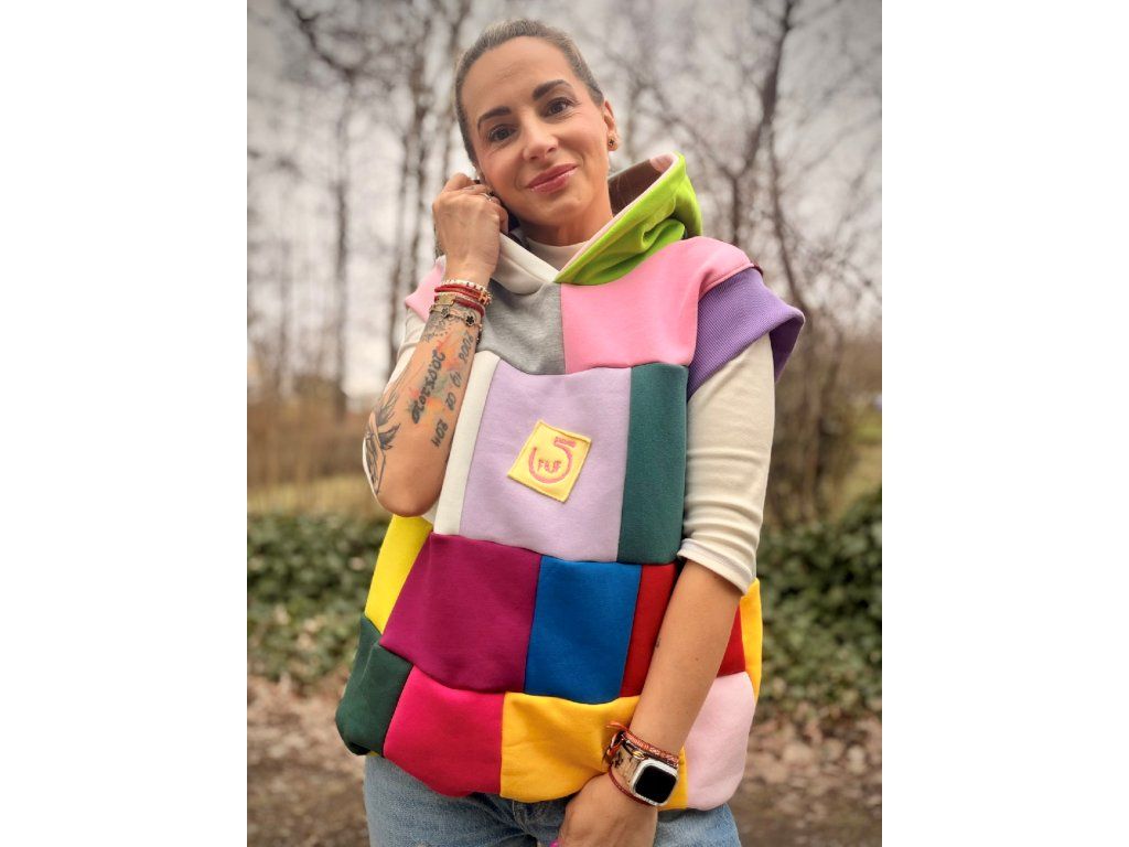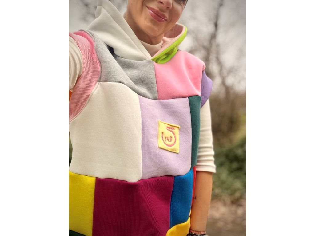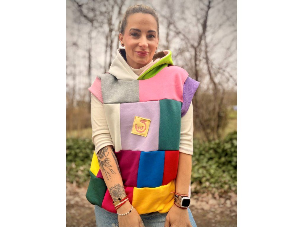 Originální vesta, která rozzáří každý den! Tato vesta je vyrobena z příjemné počesané teplákoviny v pestrém designu. Kombinuje různé barvy a struktury materiálu – hladkou teplákovinu i hebký fleece, díky čemuž je nejen stylová, ale i mimořádně pohodlná.