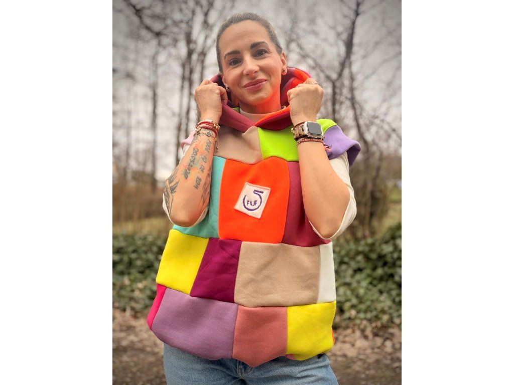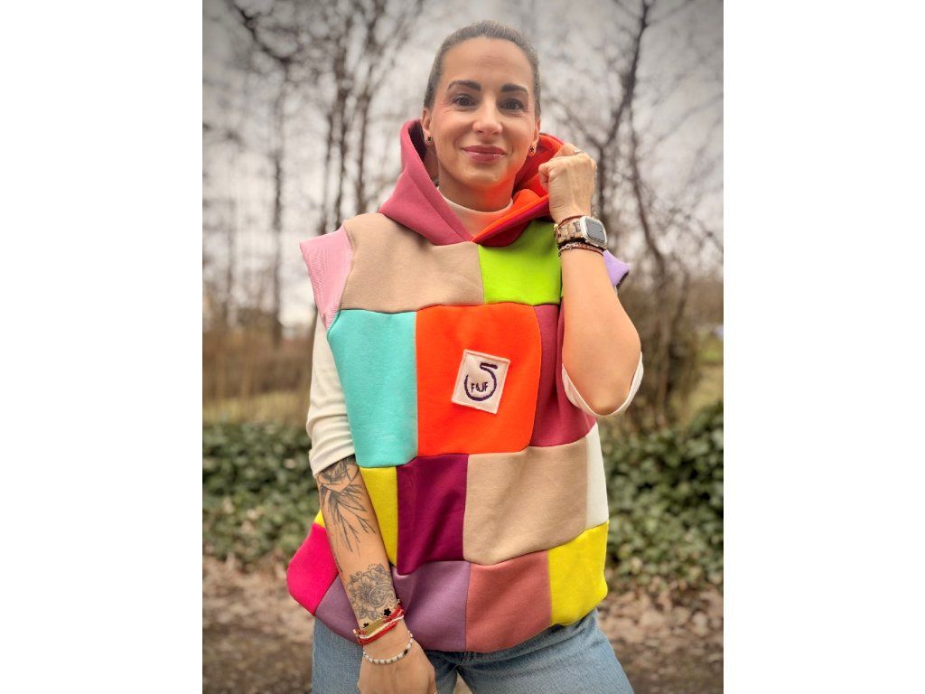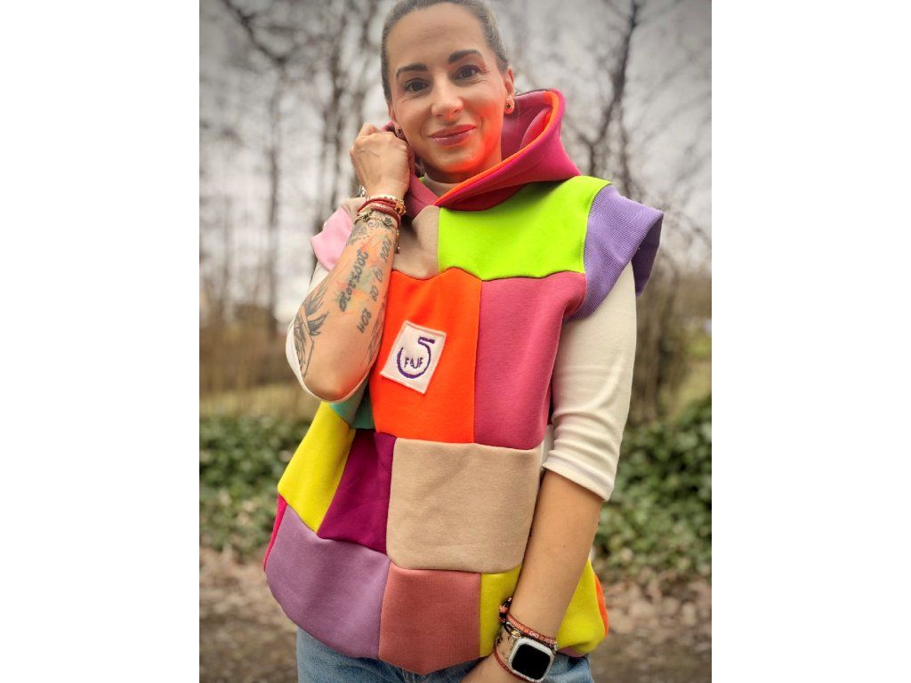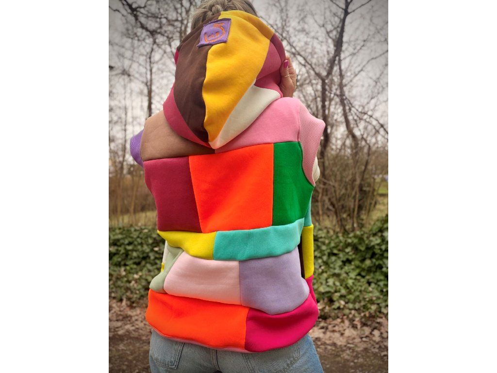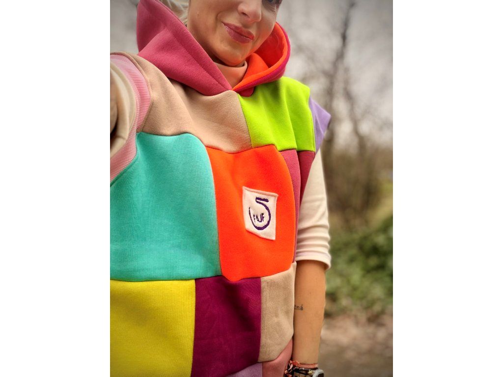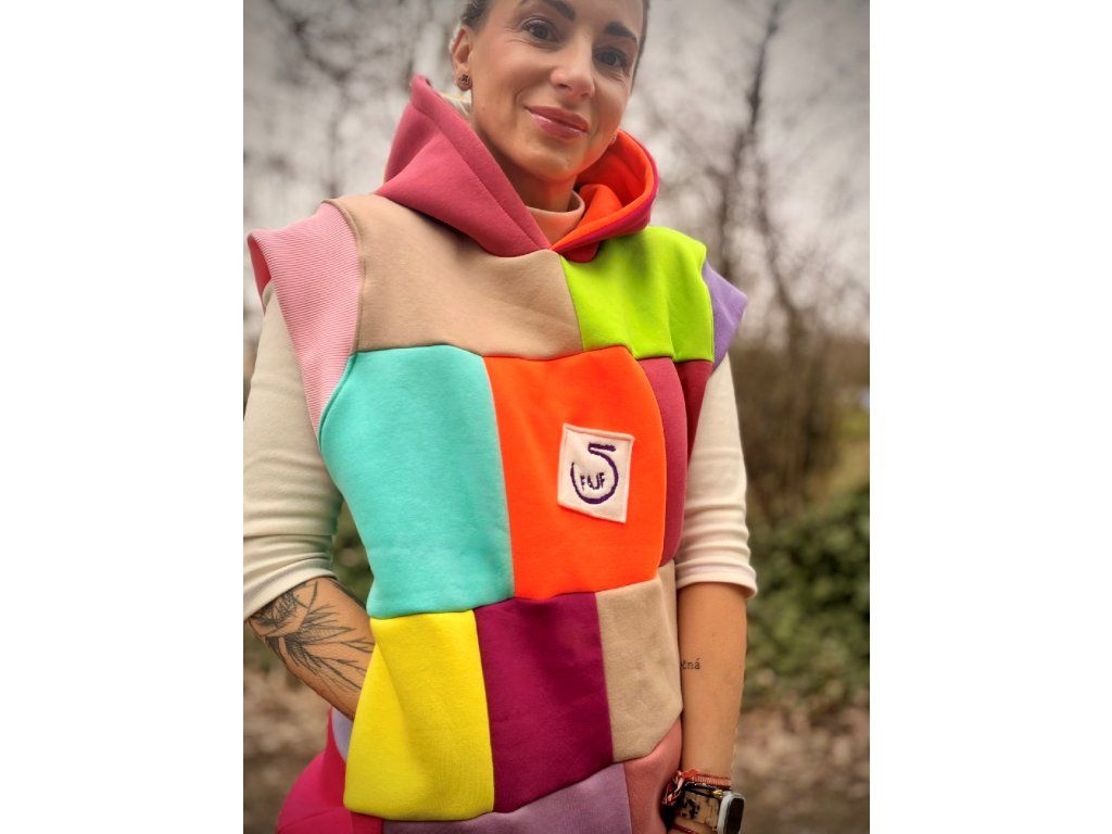 Originální vesta, která rozzáří každý den! Tato vesta je vyrobena z příjemné počesané teplákoviny v pestrém designu. Kombinuje různé barvy a struktury materiálu – hladkou teplákovinu i hebký fleece, díky čemuž je nejen stylová, ale i mimořádně pohodlná.
