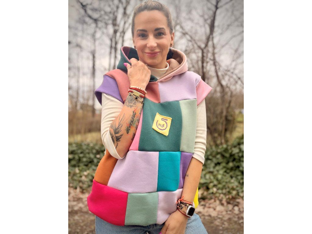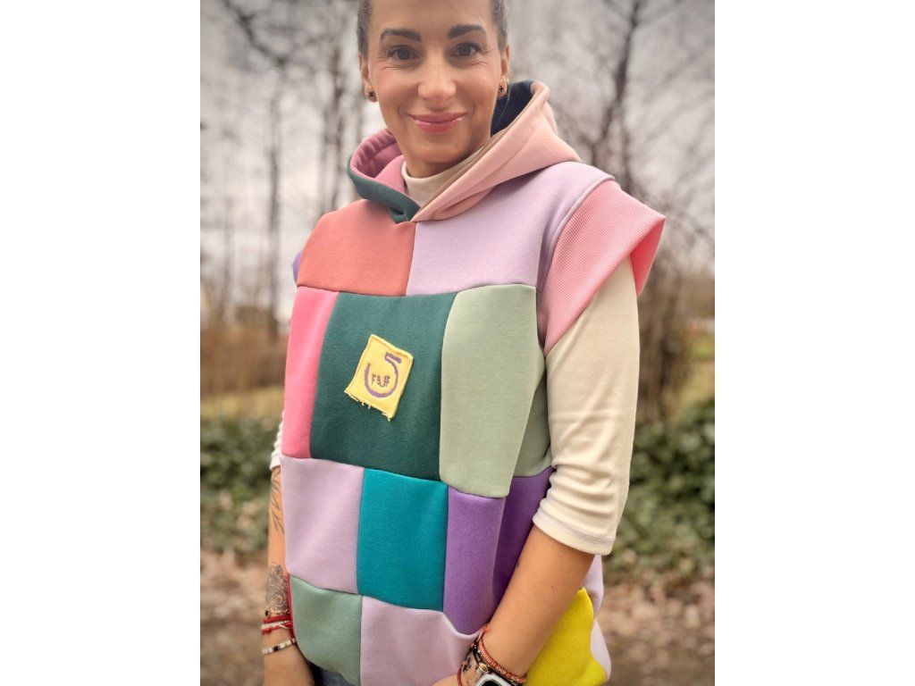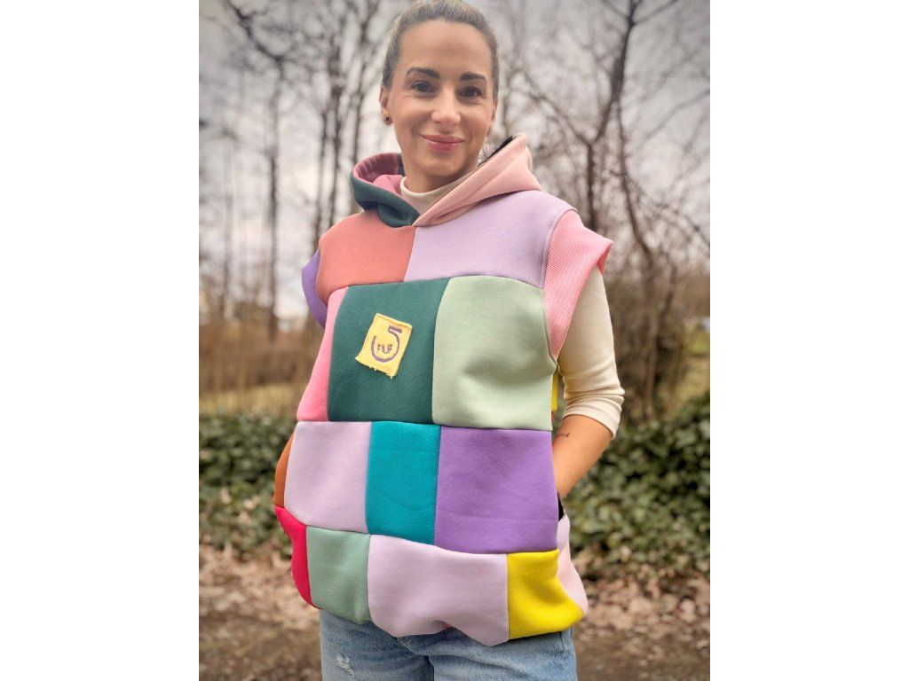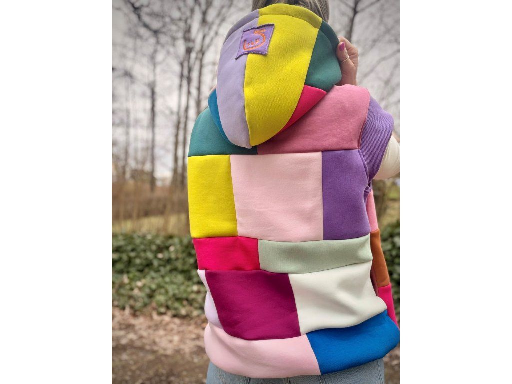 Originální vesta, která rozzáří každý den! Tato vesta je vyrobena z příjemné počesané teplákoviny v pestrém designu. Kombinuje různé barvy a struktury materiálu – hladkou teplákovinu i hebký fleece, díky čemuž je nejen stylová, ale i mimořádně pohodlná.